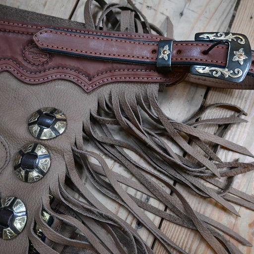 Our Teskey's quality Smooth leather shotgun chaps are accented with a tooled yoke, Three decorated conchos, belt and a single deep pocket for conve...