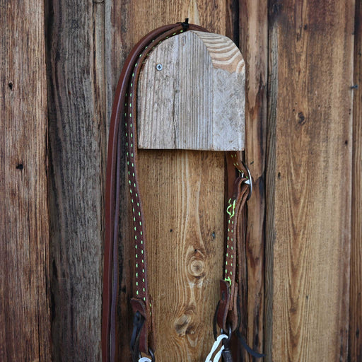 View full detailsMaker: Stamped "T" Headstall: Split Ear Headstall with Lime Green Buckstitch Reins: Split Reins Mouthpiece: Twisted Wire Dogbone Cheek: 6" Curb...