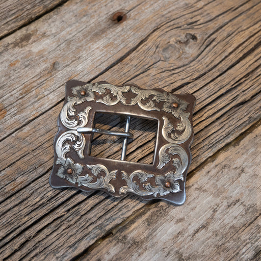 Turtle JonesHandmade Turtle Jones Keyhole buckle with silver mounted flowers. Maker: Turtle Jones Total Size: 3" X 2 1/2" Fits Belt Size: 1" All measurements...