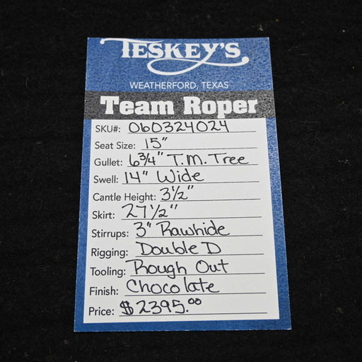 Teskey's SaddleryThis new 15" Teskey's Team roping saddle comes in a chocolate roughout with a hard seat. For more information call a saddle salesman today at 888-9...