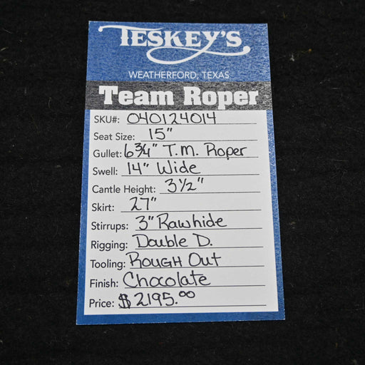 Teskey's SaddleryThis new 15" Teskey's Pro team roping saddle comes in a chocolate roughout with a hard seat. For more information call a saddle salesman today at 8...