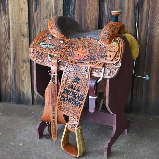 Jeff SmithThis Demo 15.5" Jeff Smith Team Roping saddle comes in a chestnut braid tooling with a hard seat. For more information call a saddle salesman today...