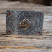A 1940s horse head belt buckle in sterling silver with a 10k gold horse head, four 10k gold flowers in the corners, and five red stones. While being unmarked and from an unknown maker, this vintage piece combines quality materials with distinctive Western design.