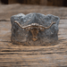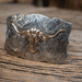 A 1950s Newman Bros belt buckle made from sterling silver with a bold 10k gold longhorn mounted in the center. This buckle showcases a classic western style through intricate metalwork, seen in the silver engraving surrounding the longhorn.