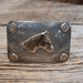 A 1950s Renalde horse head belt buckle featuring a centered 10k gold horse head with four 10k gold flowers positioned in each corner. Made from sterling silver with quality craftsmanship. This vintage piece combines quality materials with authentic Western design.