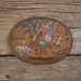 This 1980 calf roper trophy buckle is made from copper and is silver mounted. A delightful acquisition that celebrates rodeo heritage and the tradition of authentic Western sportsmanship.