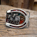 This 1984 Bergamont Brass Words Belt Buckle designed with a Bulldogger inside a horseshoe. MADE in the USA