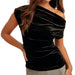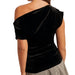 Elevate your wardrobe with this refined black velvet top, featuring an elegant asymmetrical neckline and strategically placed ruching for a flattering silhouette. Crafted from a luxurious polyester and spandex blend, this short-sleeved piece offers both comfort and sophistication. Perfect for transitioning from day to evening occasions with understated glamour.
