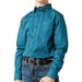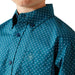 This boy's button-down shirt features a dark teal geo print throughout, long sleeves, and a front left pocket. Made from 100% cotton, it offers classic fit comfort and a stylish, casual look.