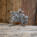 This John Hartman Buffalo Riding Cowboy Pin is a remarkable piece of wearable art, handcrafted by renowned artisan John Hartman in Durango, Colorado. The pin features a highly detailed, three-dimensional scene of a cowboy expertly riding a charging buffalo, capturing the rugged spirit of the American West.