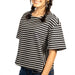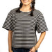 This sophisticated striped top features a striking black and white pattern with a relaxed, boxy silhouette. The crew neckline and short sleeves offer effortless style, while contrasting side panels and subtle hem slits add contemporary detail. Crafted from pure cotton, it's breathable and comfortable for everyday wear. Perfect for layering or wearing solo, this versatile piece transitions seamlessly from casual to polished occasions.