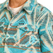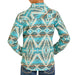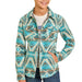 This refined boy's shacket showcases a striking teal Aztec jacquard pattern that blends Western heritage with contemporary style. Crafted from pure cotton for breathability and durability, it features a classic snap-button front, dual chest pockets for practical storage, and hip pockets for added functionality. The long sleeves provide versatile layering options across seasons, making it an essential piece for any young cowboy's wardrobe.