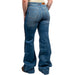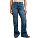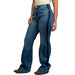 These jeans feature a medium wash with dark blue side seams and a high-rise fit. Designed with a zip fly and button closure, they are tailored to fit snugly through the hips. Crafted with Tin Haul branded zippers, buttons, and rivets, they showcase five-pocket styling along with subtle whisker and hand-sanded detailing for a refined finish.