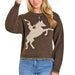 Celebrate Western heritage in style with the Rock & Roll Denim Women's Dark Brown Horse Rider Sweater. Crafted in a rich dark brown hue, this long-sleeve sweater features a striking horse rider design that adds authentic Western flair. Soft, comfortable knit fabric ensures cozy wear, making it perfect for casual outings, ranch days, or layering under jackets for cooler weather.