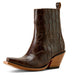 The Ariat Women's Jade Western Snip Toe Bootie features a full-grain leather upper with an espresso crocodile print. It includes a snip toe design, interior zip closure, and leather lining for durability and comfort. The bootie has single-stitched welt construction and a hand-nailed leather outsole with a rubber heel cap for traction. Elastic gore panels on the sides ensure a snug fit, complemented by a Western-style heel and a brown caiman print for a distinctive look. The comfort insole is non-removable, providing long-lasting support.