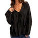 Elevate your wardrobe with this refined black top, featuring a flattering V-neckline and graceful ruffle detailing. Long sleeves and a front tie create an effortlessly polished silhouette, while the luxurious rayon-blend fabric (80% rayon, 20% polyester) drapes beautifully for all-day comfort and elegance.