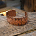 This Native Made Copper Cuff is a beautiful example of traditional craftsmanship. Made from solid copper, the band features an intricately hand-stamped design that wraps around the entire cuff, offering a timeless and rugged aesthetic.