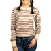 This refined striped cardigan features a sophisticated blend of premium materials—50% nylon, 25% wool, and 15% acrylic—for lasting comfort and durability. The cropped silhouette pairs beautifully with high-waisted bottoms, while the classic brown, oat, and butter stripe pattern offers versatile styling options. Long sleeves with ribbed cuffs provide structure, complemented by a ribbed collar and hem for a polished finish. The button-down closure allows for effortless layering and styling flexibility throughout the season.