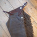 Our Teskeys Quality Smooth leather shotgun chaps feature Chocolate leather, a basketweave tooled double yoke, one silver concho, tie-ring and a single deep pocket for convenience. Great for Show or Ranching.
