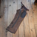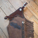 Our Teskeys Quality Roughout leather shotgun chaps are made from chocolate leather with a basketweave tooled double yoke, one silver concho, tie-ring and two deep pockets for convenience. Great for Show or Ranching.