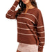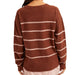 This refined V-neck sweater features a sophisticated brown and dusty pink striped pattern that effortlessly elevates any wardrobe. The long sleeves and classic V-neckline are finished with ribbed detailing at the collar, cuffs, and hem for a polished look. Practical side slits add movement and comfort to the silhouette. Crafted from a durable blend of 70% polyester, 20% acrylic, and 10% nylon, this piece offers both style and lasting quality.