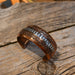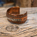 This Vintage Copper Cuff features a refined blend of materials, showcasing intricate sterling silver accents set against a warm, solid copper band. The hand-stamped detailing and aged patina give it an authentic, heritage Western look.