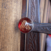Hand-tooled vintage bridle rig with silver Crockett bit, beautiful red rosettes, and rein chains. Crafted with authentic Western tack quality and traditional materials. A genuine piece for collectors and riders who value vintage cowboy equipment.
