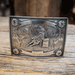 A vintage barrel racer buckle with red stones at each corner and stamped "WI" on the back. This authentic rodeo piece features striking stone work that catches the eye. A genuine collectible with real Western competition heritage.