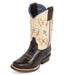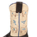 This youth Roper boot showcases a striking combination of crackle cream leather on the upper paired with rich oily brown leather on the vamp, accented by an authentic cattle brand print. The cutter toe silhouette provides the functional design preferred by young riders and ranch workers. Engineered with quality construction and traditional Western styling, it delivers durability and the classic look that defines working cowboy boots.