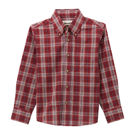 WranglerStyle # 112369630 This Wrangler boy's shirt features a cranberry and multicolor plaid pattern with long sleeves and a button-down front. Designed i...