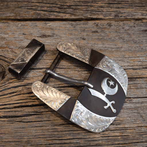 Wayne DollarHandmade by Wayne Dollar Silver Mounted Schriner Logo Total Size: 3" X 3 1/4" Belt Size: 1 1/4" fits a 1" belt All measurements are Approxima...