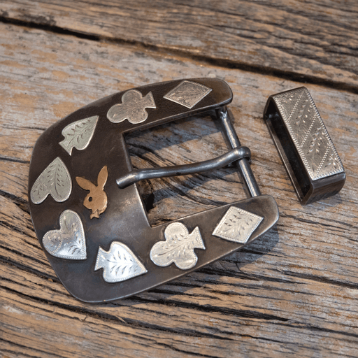 Wayne DollarHandmade by Wayne Dollar Silver Mounted Deck of Cards and Copper Bunny Total Size: 3" X 3 1/4" Belt Size: 1 1/4" fits a 1" belt All measureme...