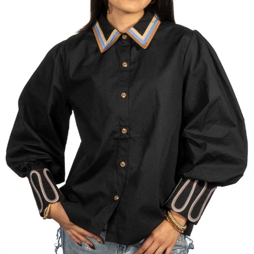 JodiflStyle # B12494 This refined black button-down shirt features elegant embroidered detailing along the collar and sleeves for understated elegance. C...