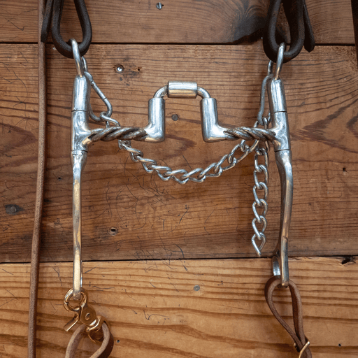 Myler USAMaker: Myler USA Headstall: Leather Single Ear Reins: Leather Barrel Reins Mouthpiece: Twisted Wire Hinge Port Correction Shank: 7 1/2" Curb: Cha...