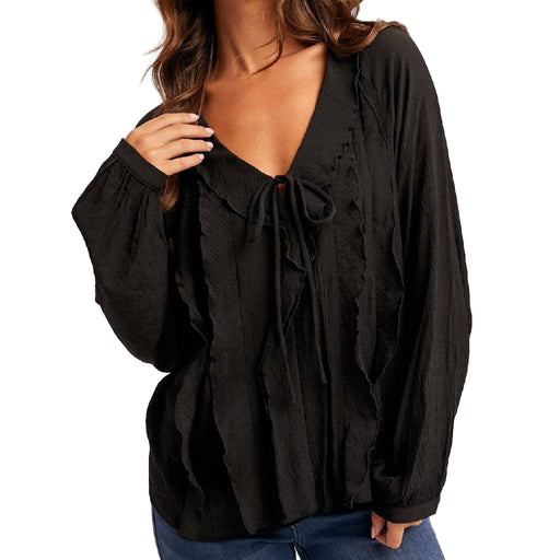 HEM & THREAD, INC.Style # 36595 Elevate your wardrobe with this refined black top, featuring a flattering V-neckline and graceful ruffle detailing. Long sleeves and ...