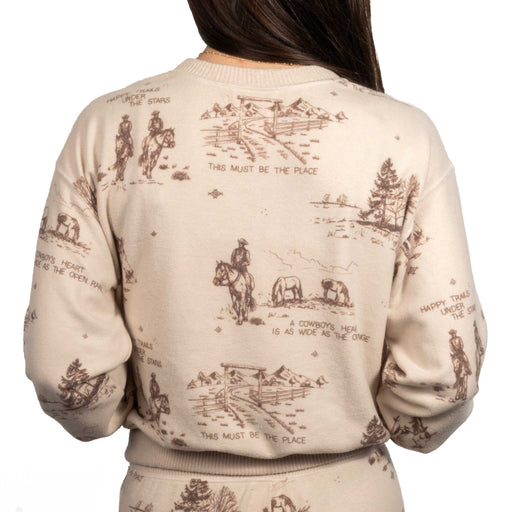 All Time FavoriteStyle # 464H Crafted from a luxurious blend of polyester, rayon, and spandex, this bone-hued pullover sweatshirt features an elegant equestrian pri...