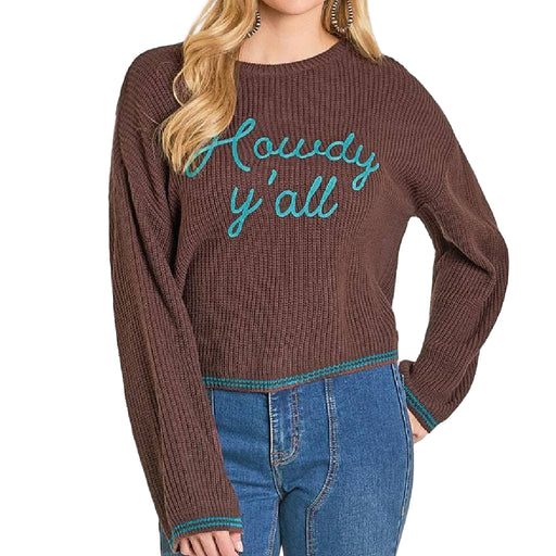 PanhandleStyle # BW32T07770 Embrace Western charm with this Rock & Roll Denim sweater, featuring a rich chocolate hue and playful "Howdy Y'all" embroide...