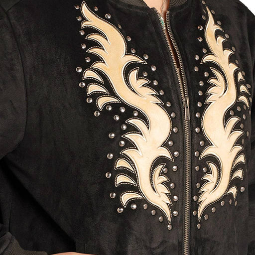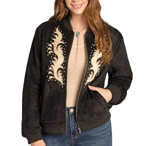 PanhandleStyle # BW92C07786 Bring a bold Western edge to your outerwear with the Rock & Roll Denim Women's Black Microsuede Applique Bomber. Crafted fro...