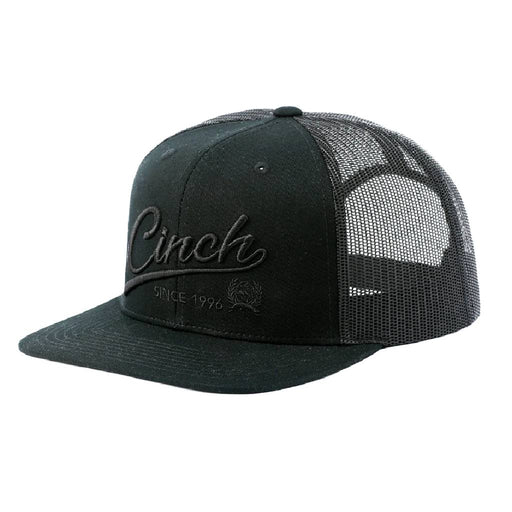 CinchStyle # MCC0760003 This classic black trucker cap features a structured six-panel silhouette with refined mesh paneling at the back for breathabili...