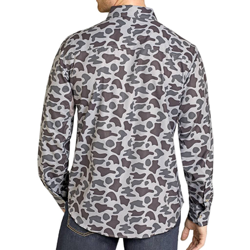 PanhandleStyle # BMN2S07673 This men's shirt features a grey camo print with long sleeves and vented underarms for enhanced breathability. It includes doubl...
