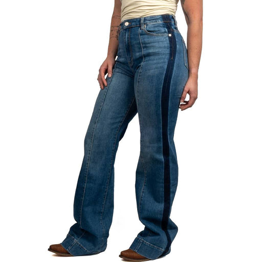 Style # 10-054-0870-4004 These jeans feature a medium wash with dark blue side seams and a high-rise fit. Designed with a zip fly and button closur...