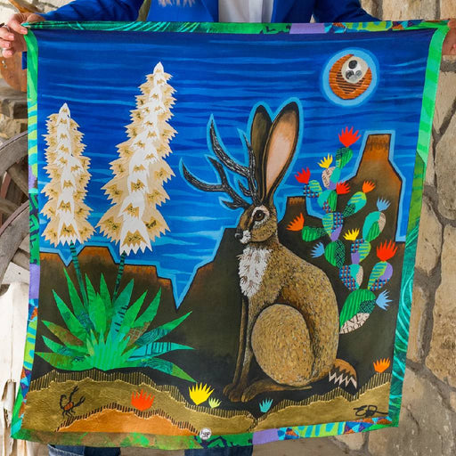Fringe ScarvesStyle # 210000541288 Song of the Jackalope is a mystical night scene featuring a resting jackalope beneath a glowing full moon and fluorescent cact...