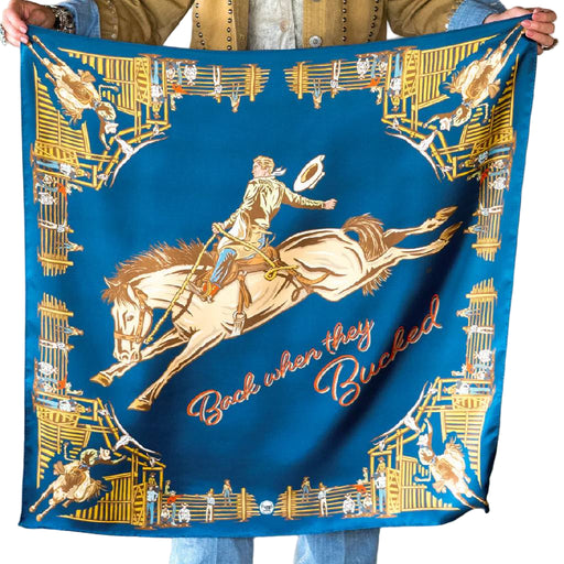 Fringe ScarvesStyle # SCRF-BWTB-NVY-TL-25067 Back When They Bucked is a tribute to the rodeo’s golden era—think 1940s–50s bronc riders, bucking chutes, and mid-c...
