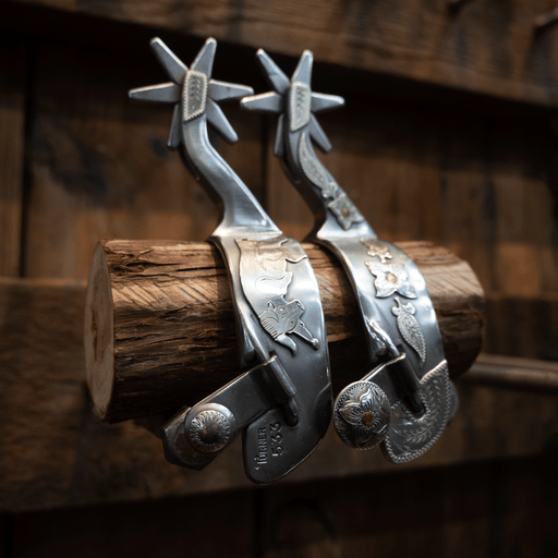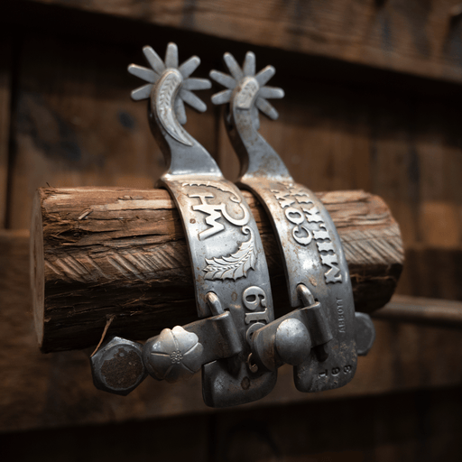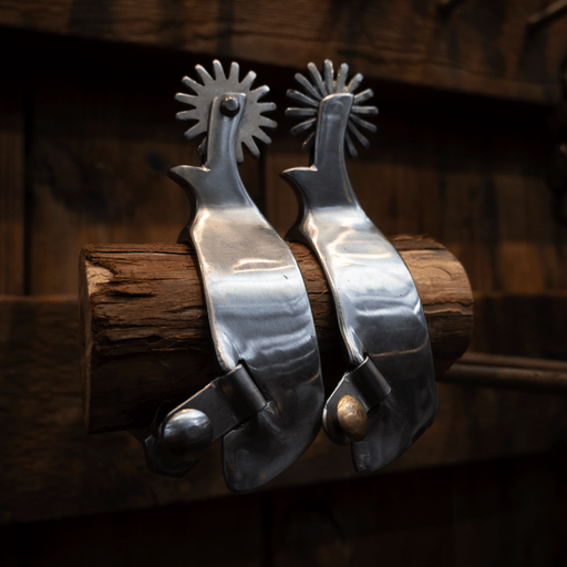 Wayne DollarMaker: Wayne Dollar Heel: 3 1/2" Band: 3/4" Shank: 1 3/4" Rowel: 6pt. Measurements are Approximate