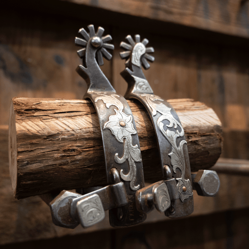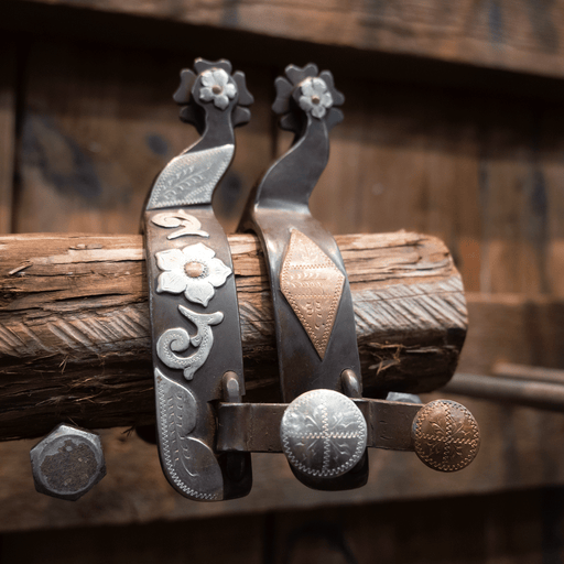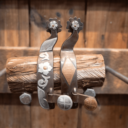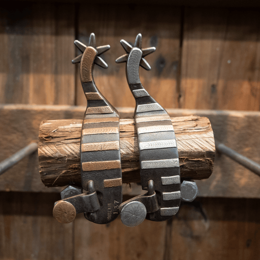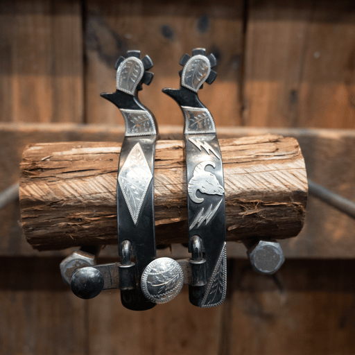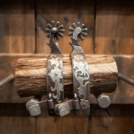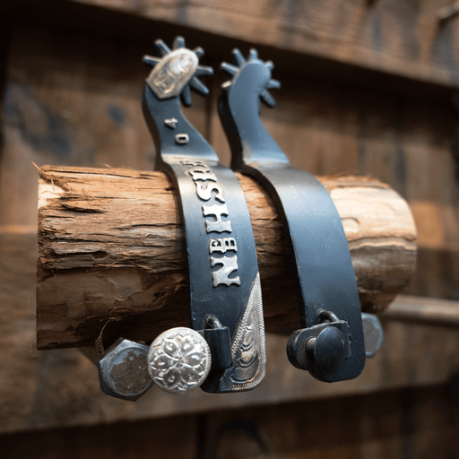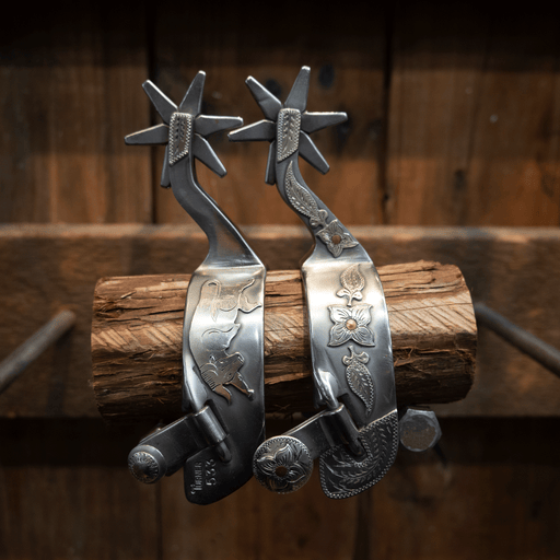 Jeff PayneMaker: Jeff Payne Heel: 3 1/4" Band: 1" Shank: 1 3/4" Rowel: 5pt. Measurements are Approximate
