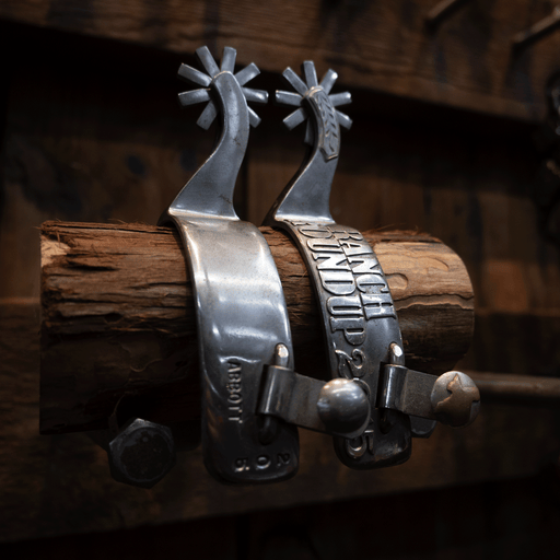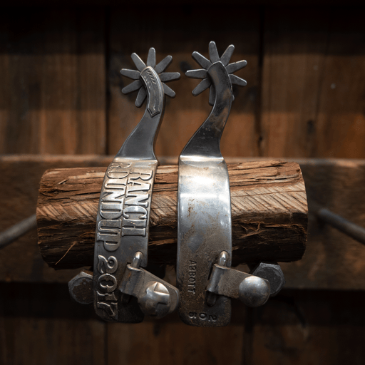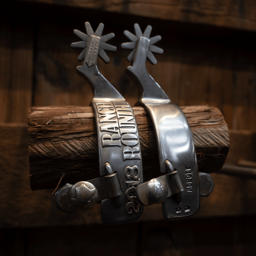 Larry AbbottMaker: Abbott Heel: 3 1/2" Band: 1" "2018 Ranch Roundup" Mounted on Band Shank: 2" Rowel: 9pt. Measurements are Approximate