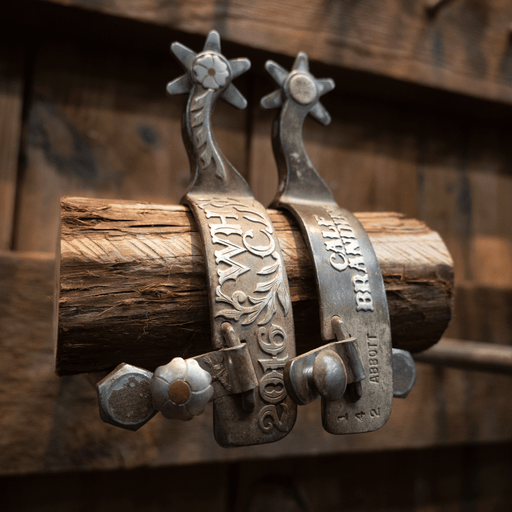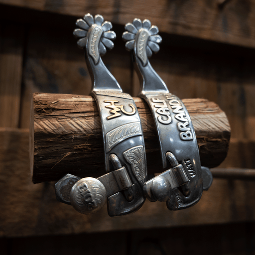 Larry AbbottMaker: Abbott Heel: 3 1/4" Band: 1" "WHC - Calf Branding" Mounted on Band Shank: 2 1/4" Rowel: 6pt. Measurements are Approximate