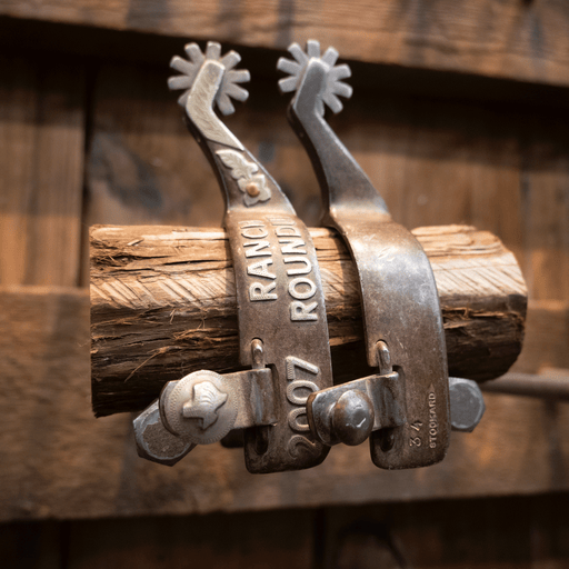 Gerald StockardMaker: Stockard Heel: 3" Band: 1" "2007 Ranch Roundup" Mounted on Band Shank: 2 1/4" Rowel: 10pt. Measurements are Approximate