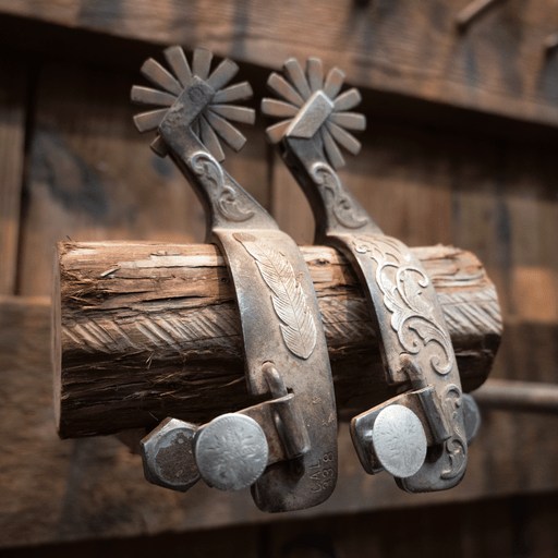 Jason SinclairMaker: Jason Sinclair Heel: 3 1/2" Band: 1 1/4" Shank: 2 1/4" Rowel: 6pt. Measurements are Approximate