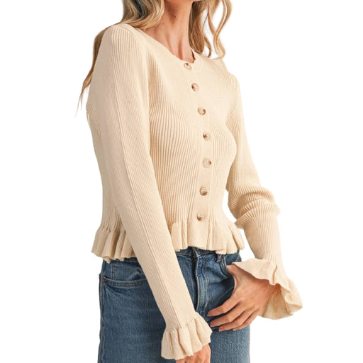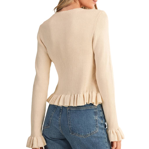 En MerciStyle # MSW11249 Elevate your everyday wardrobe with this sophisticated ruffle hem ribbed cardigan in timeless eggshell. The fitted ribbed bodice p...